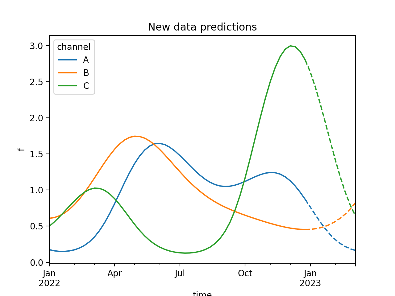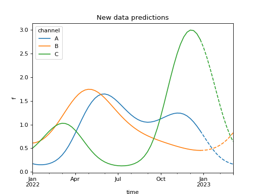 ax.set(xlabel="time", ylabel="f", title="New data predictions")