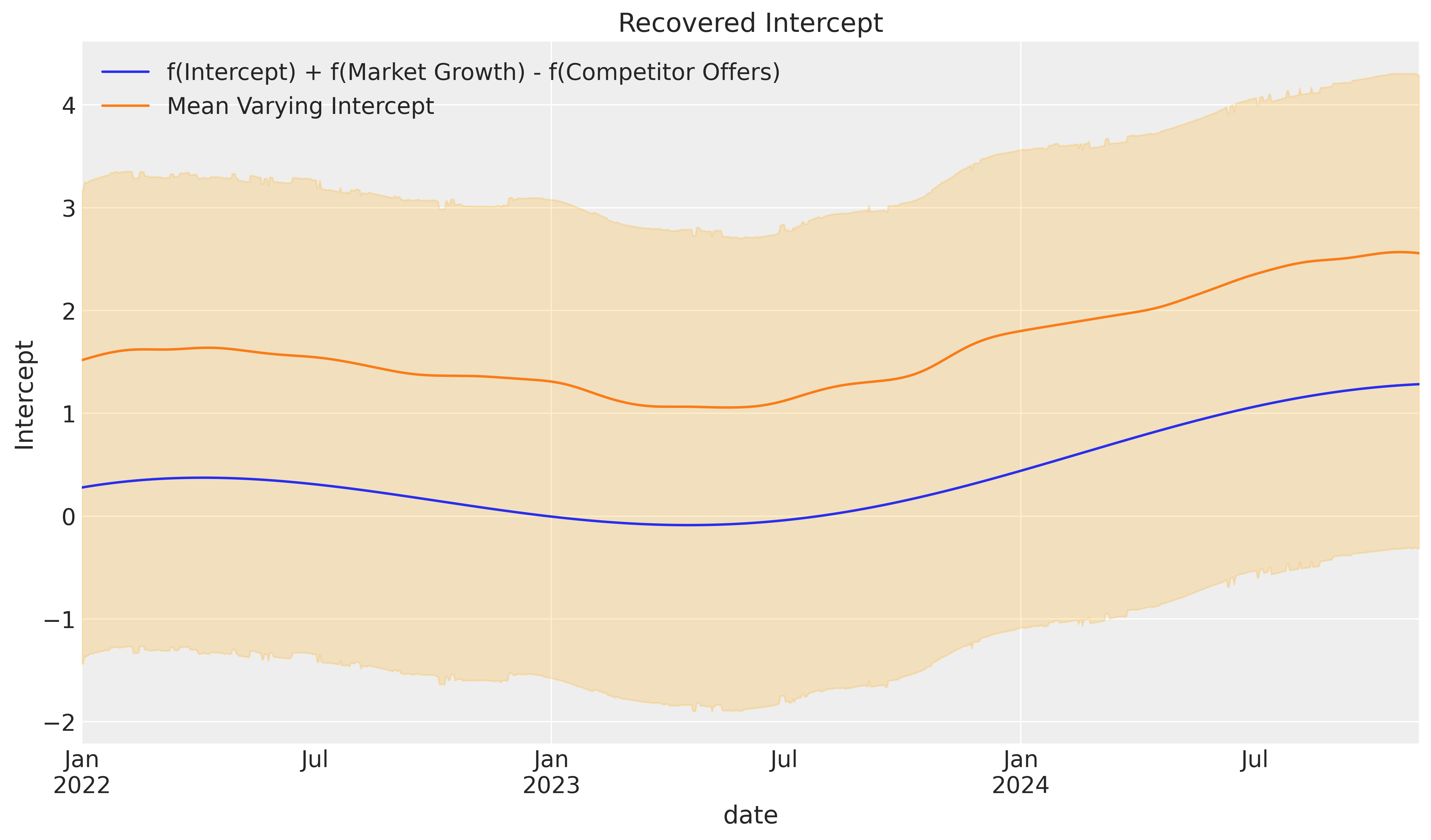 You might have noticed we have variables like market growth that aren’t in the data—what’s going on with that? Before diving in, let’s observe the time-varying intercept.