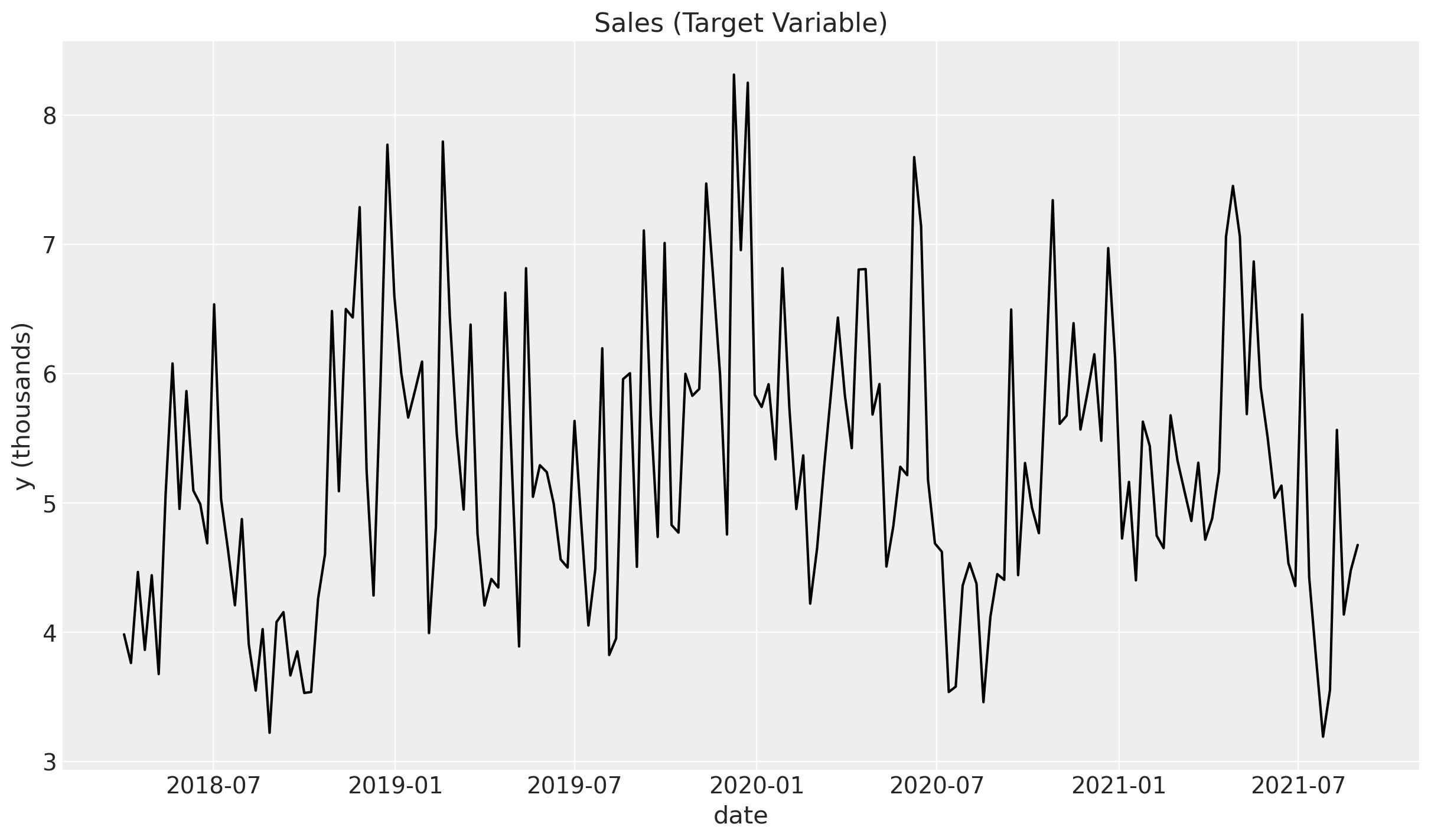 In Part I of this notebook we focus on the data generating process. That is, we want to construct the target variable \(y_{t}\) (sales) by adding each of the components described in the Business Problem section.