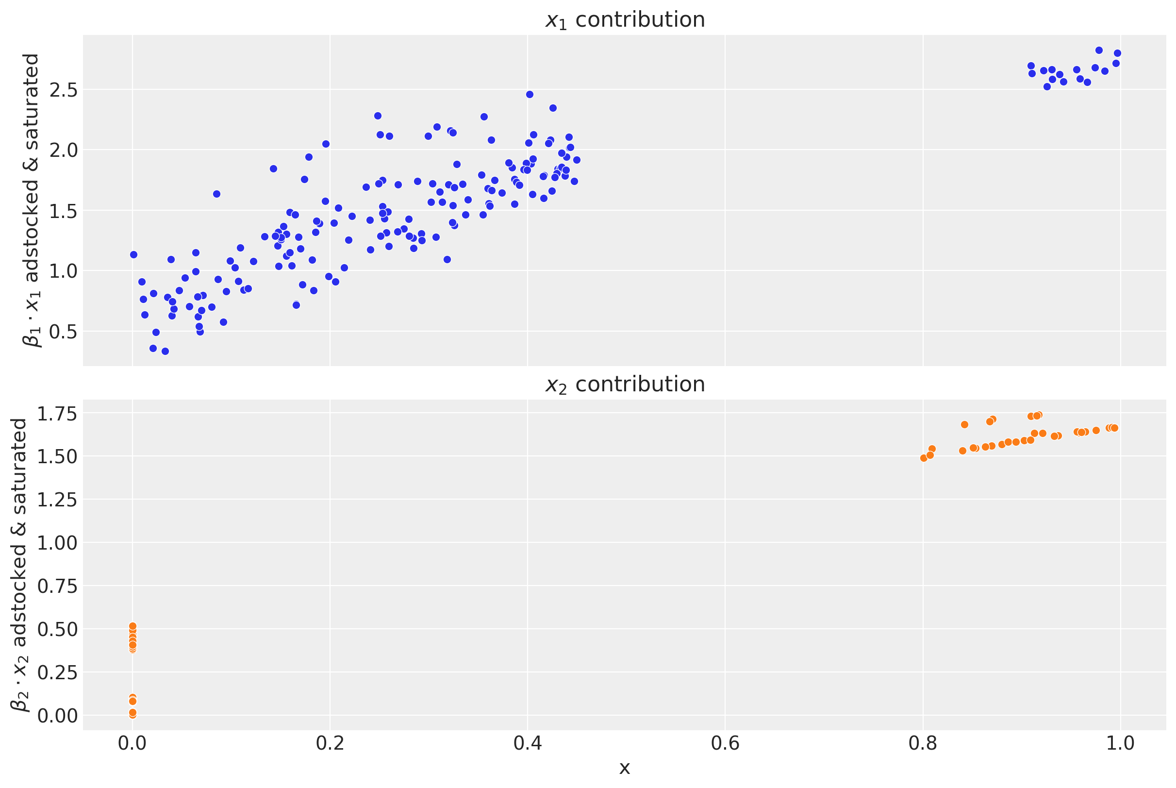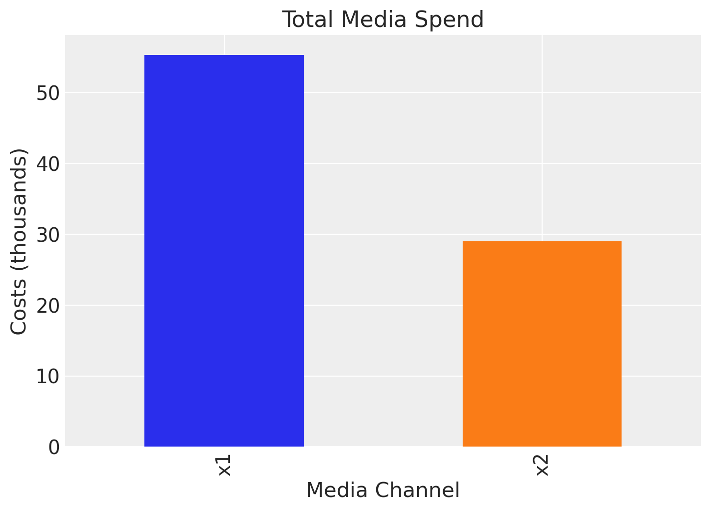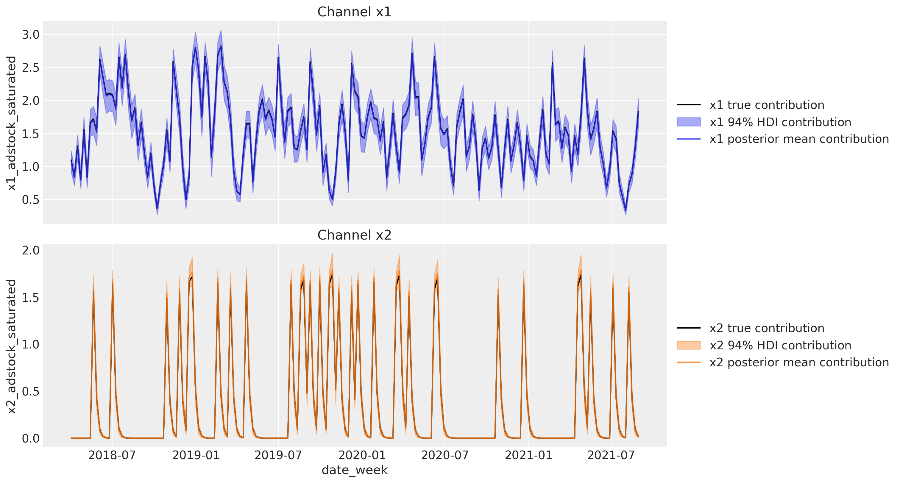 Remark: By design, \(x_{1}\) should resemble a typical paid social channel and \(x_{2}\) a offline (e.g. TV) spend time series.