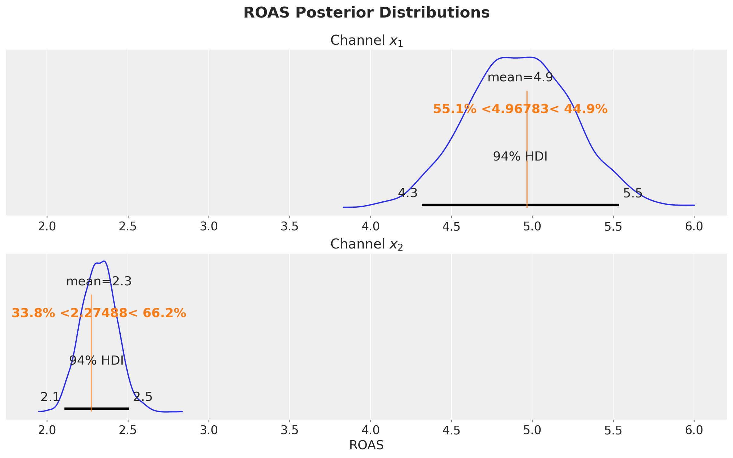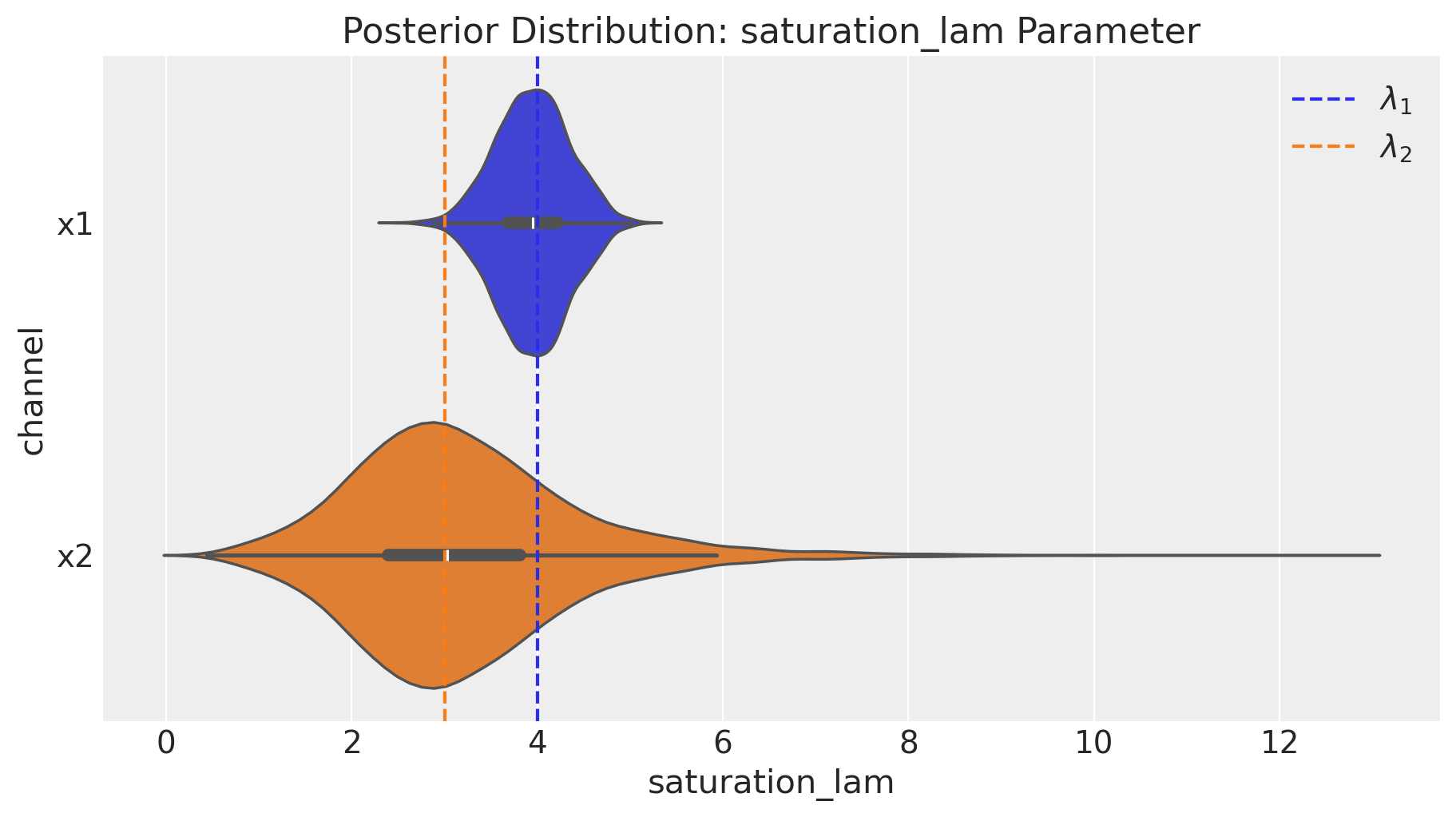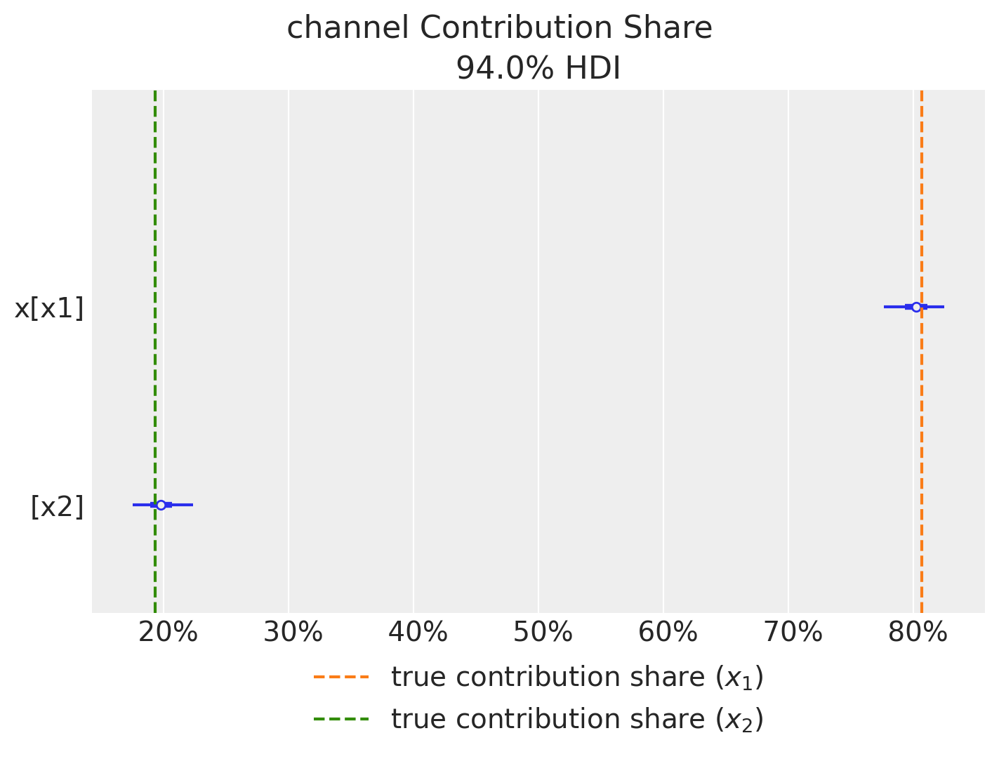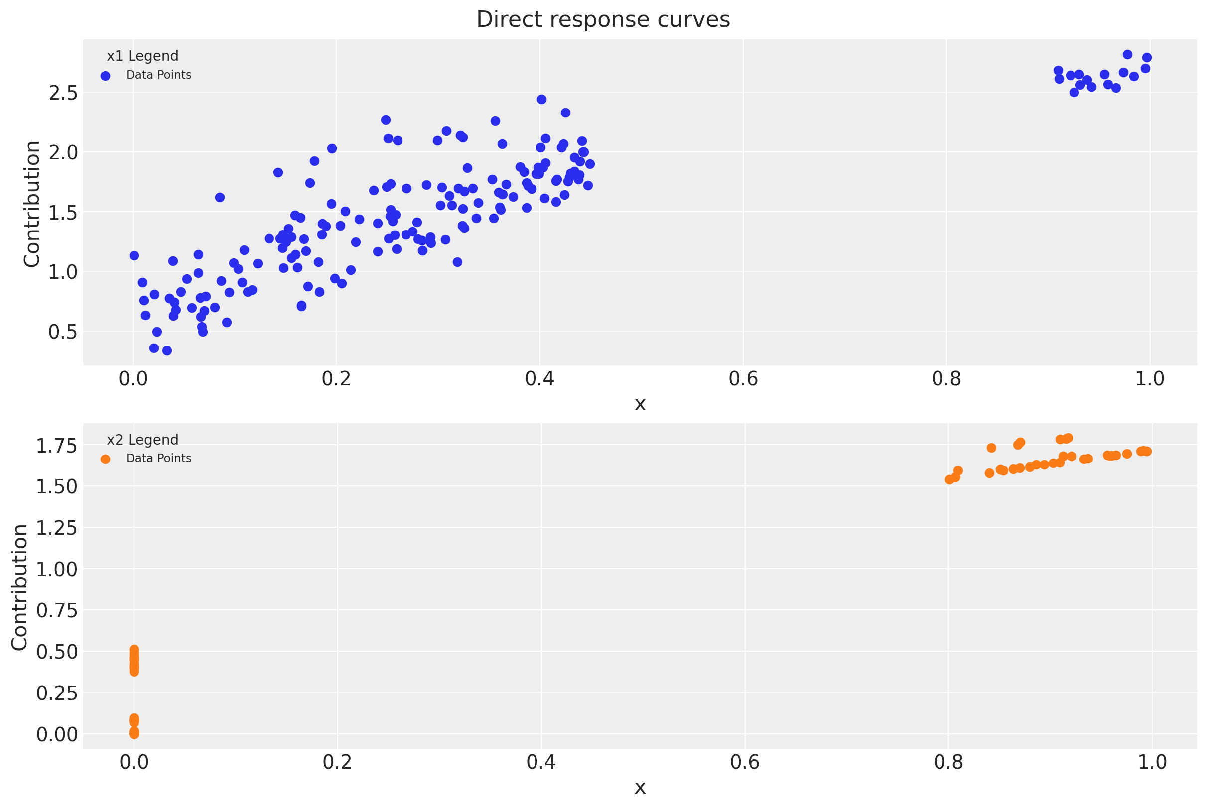 Remark: By design, \(x_{1}\) should resemble a typical paid social channel and \(x_{2}\) a offline (e.g. TV) spend time series.