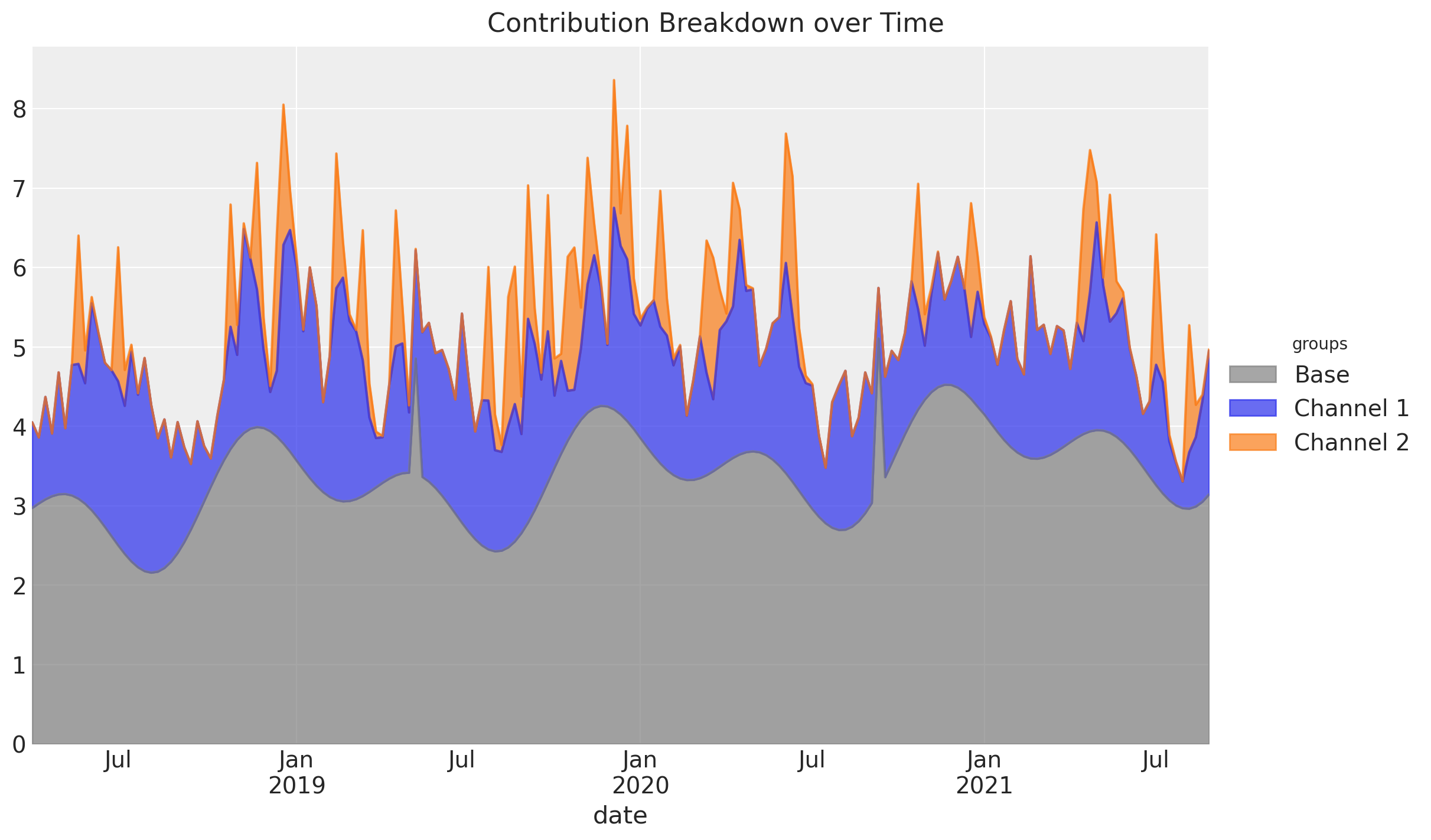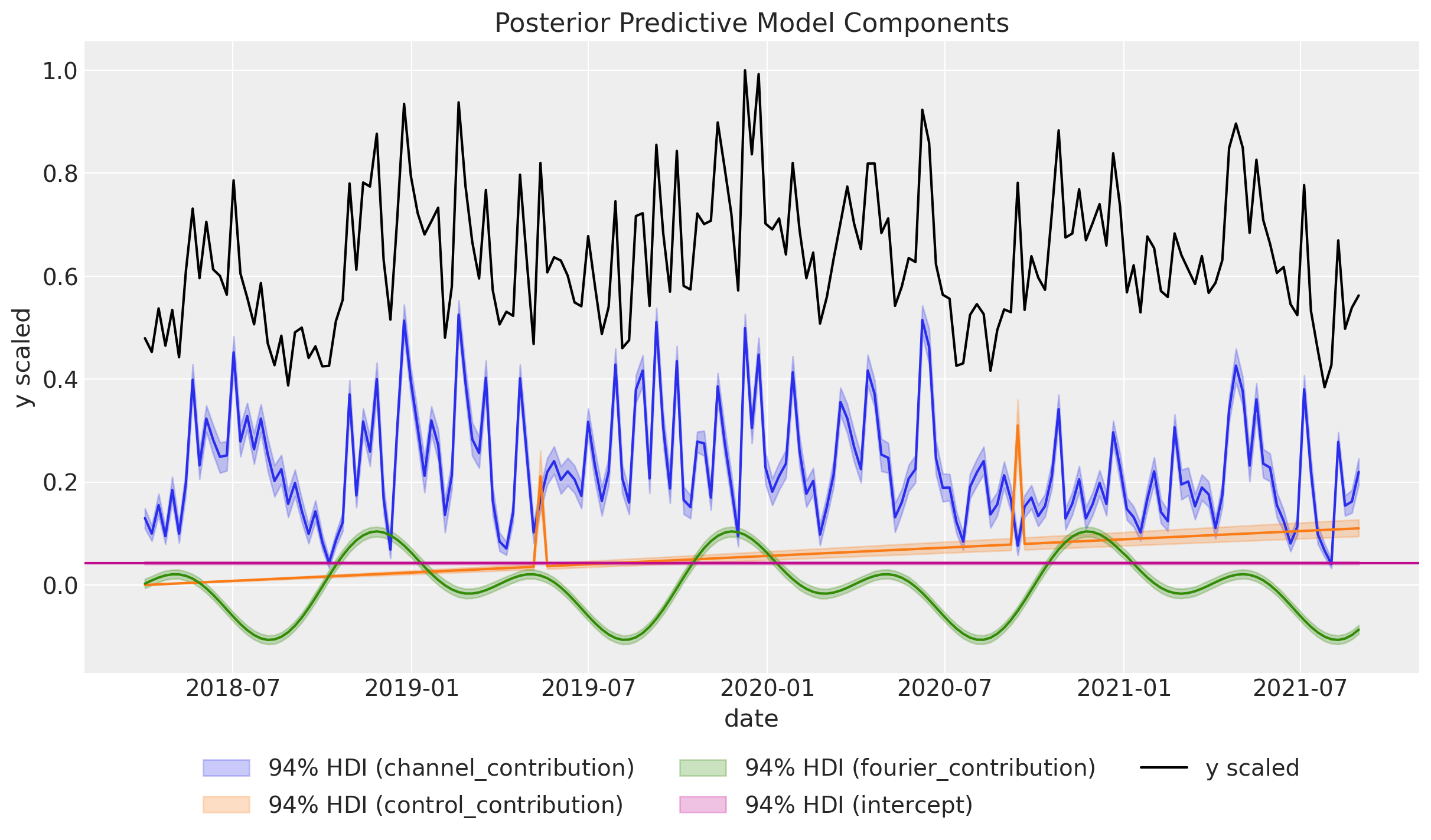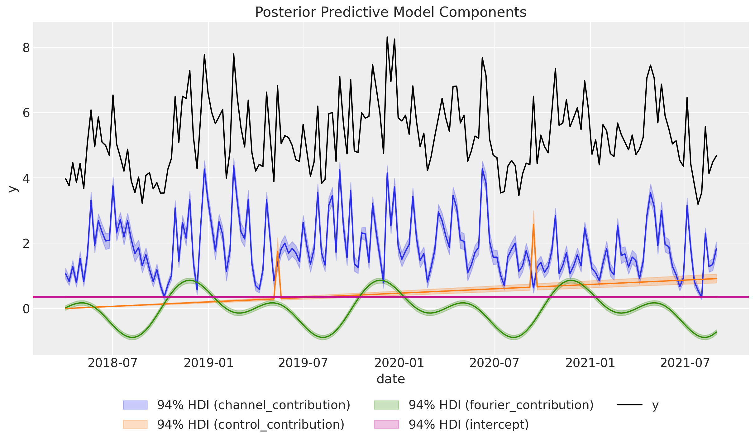 • Time-varying Intercept: Capture time-varying baseline contributions in your model (using modern and efficient Gaussian processes approximation methods). That is, we allow the intercept term \(\alpha = \alpha(t)\) to vary over time. See mmm_tvp_example.