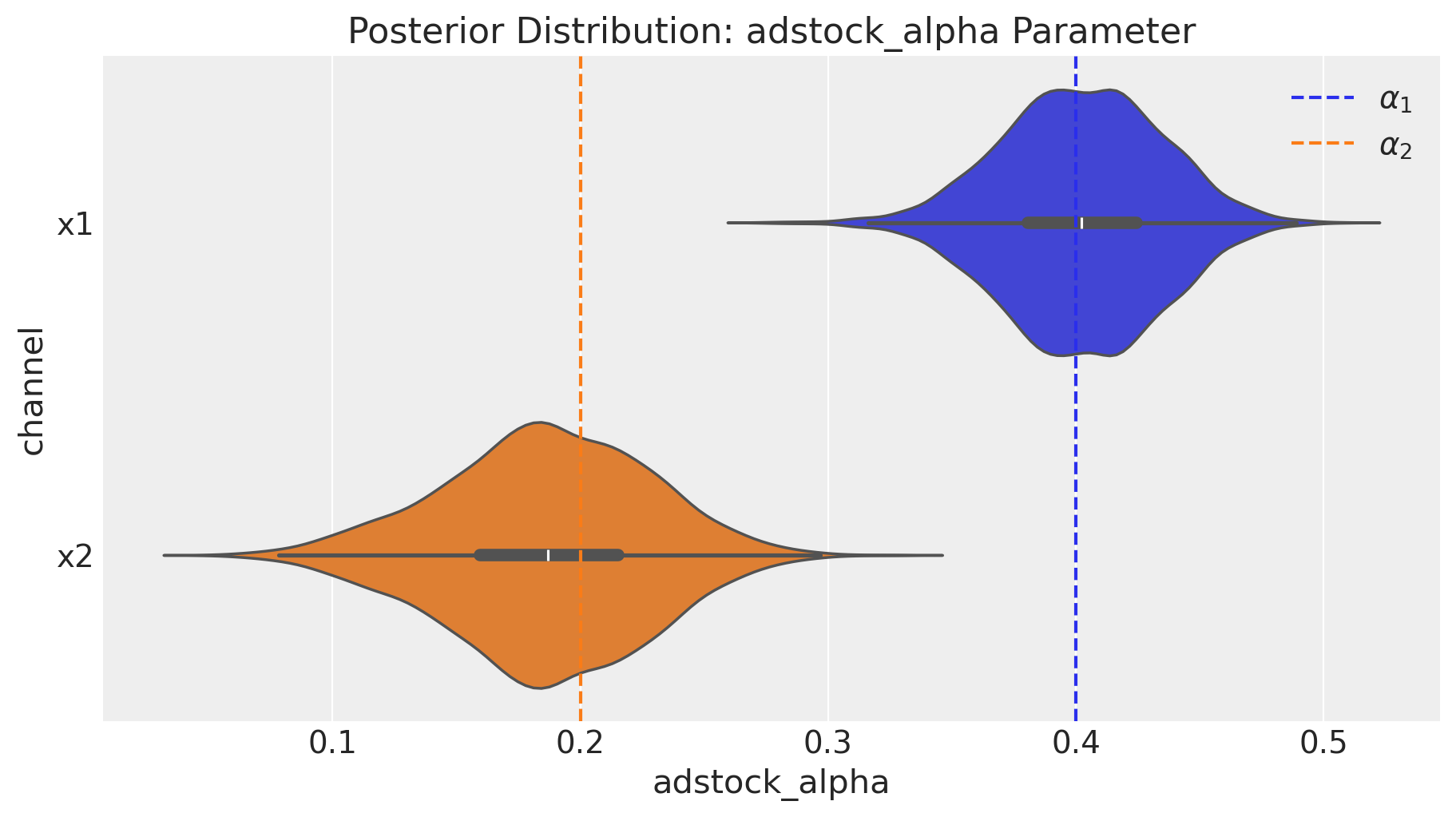 Let’s start with the adstock transformation. We set the adstock parameter \(0 < \alpha < 1\) to be \(0.4\) and \(0.2\) for \(x_1\) and \(x_2\) respectively. We set a maximum lag effect of \(8\) weeks.
