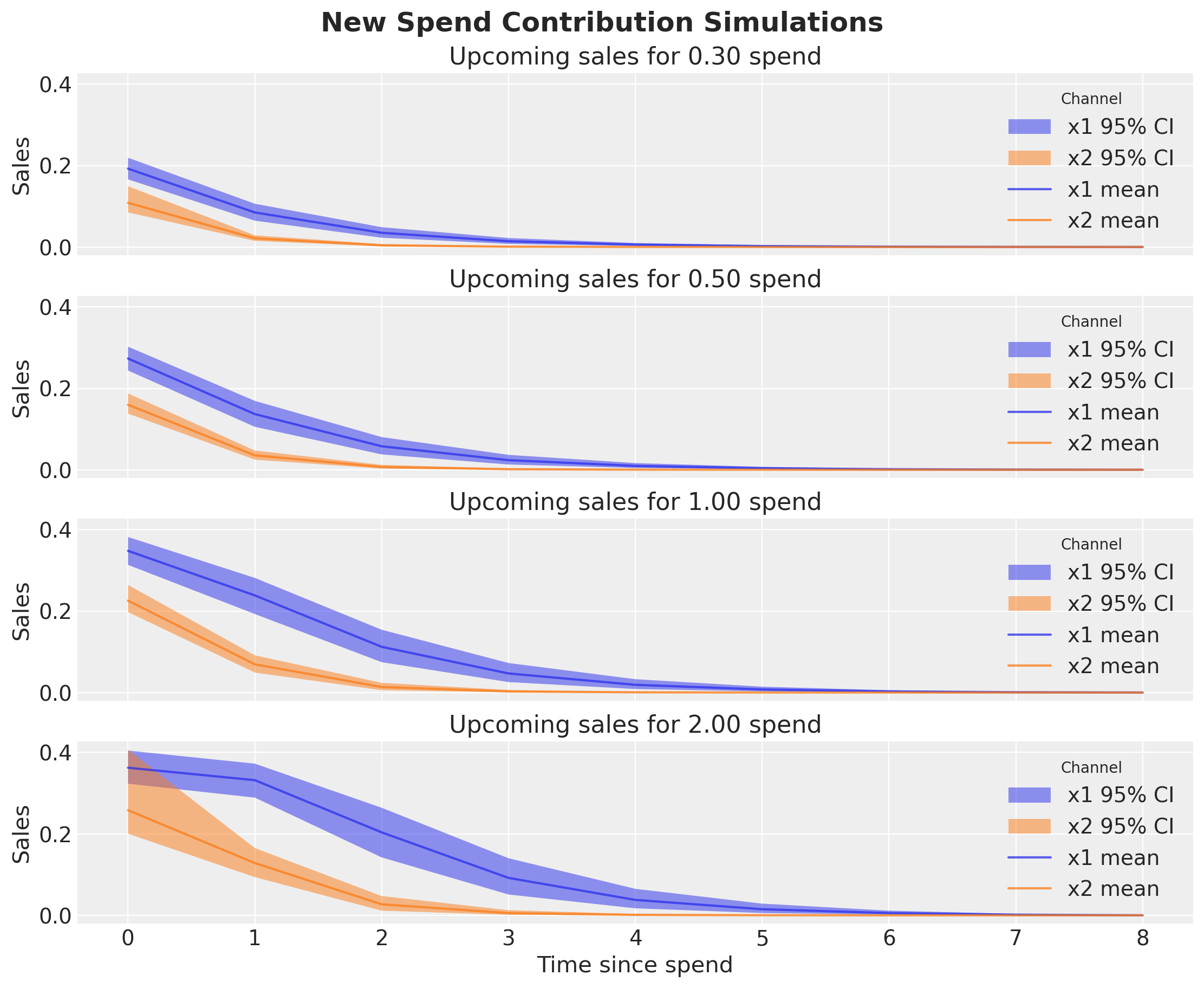 We clearly see that since \(x_1\) has a higher adstock parameter \(\alpha\) than \(x_2\), then for new spend on a single date (i.e. one_time) \(x_1\) has larger delayed contributions than \(x_2\).