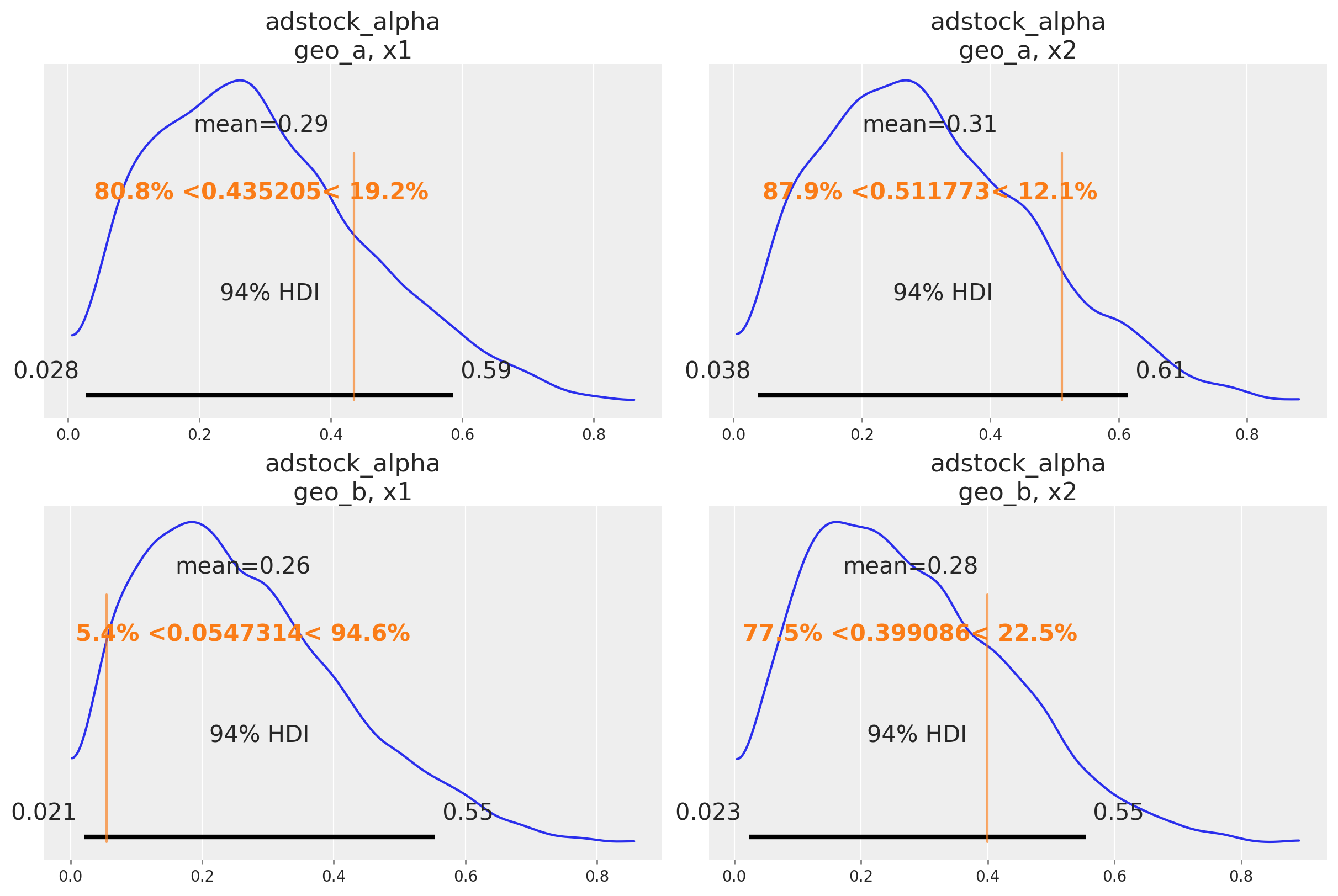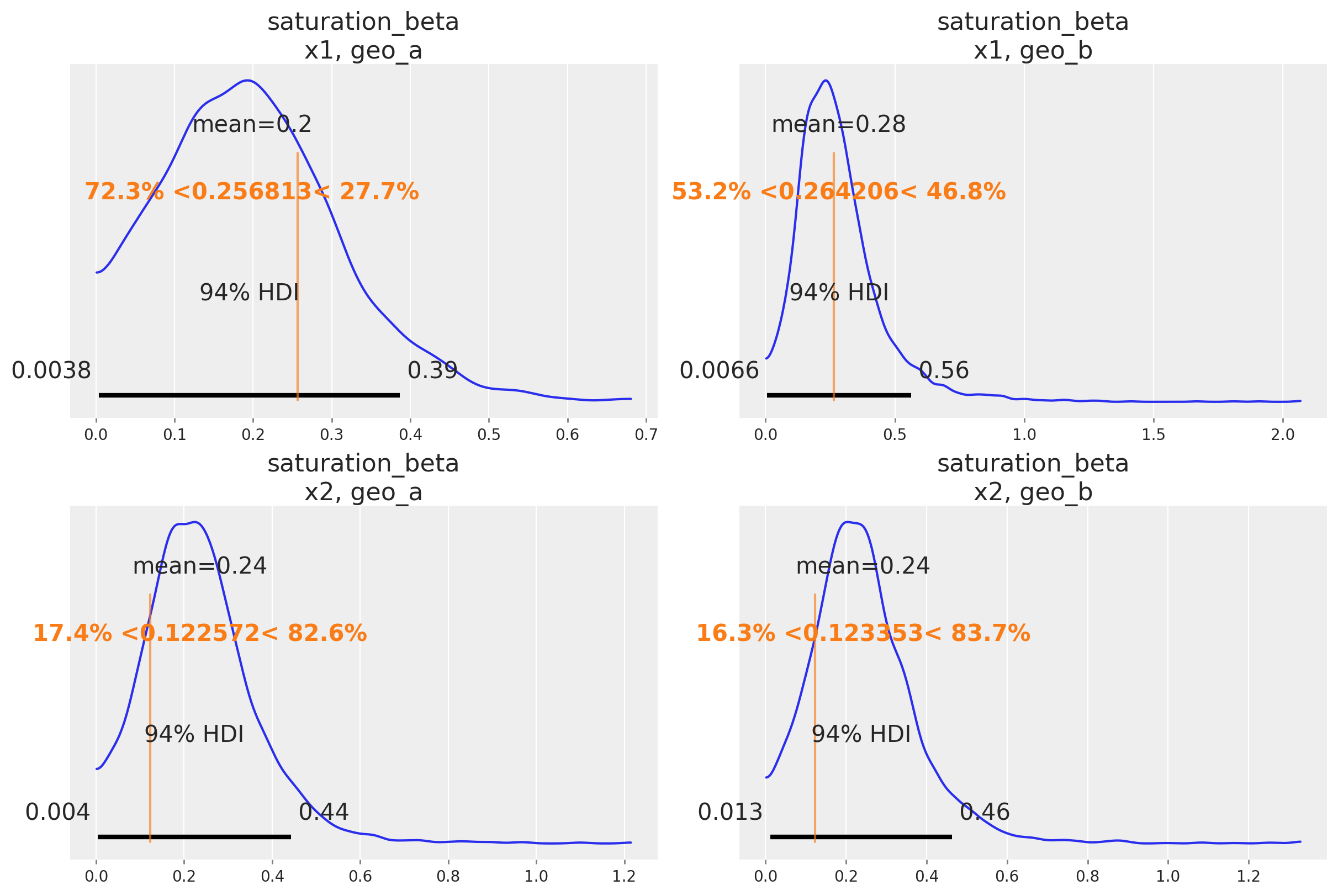 Specifically, the prior on mean captures what we expect each channel to do on average, without considering their variation on geography, while the prior on std represents how much the effect varies across geographies. std encodes the strength of “pooling”. If it’s large, channels are expected to vary widely, if it’s small they are expected to be similarly behaved.