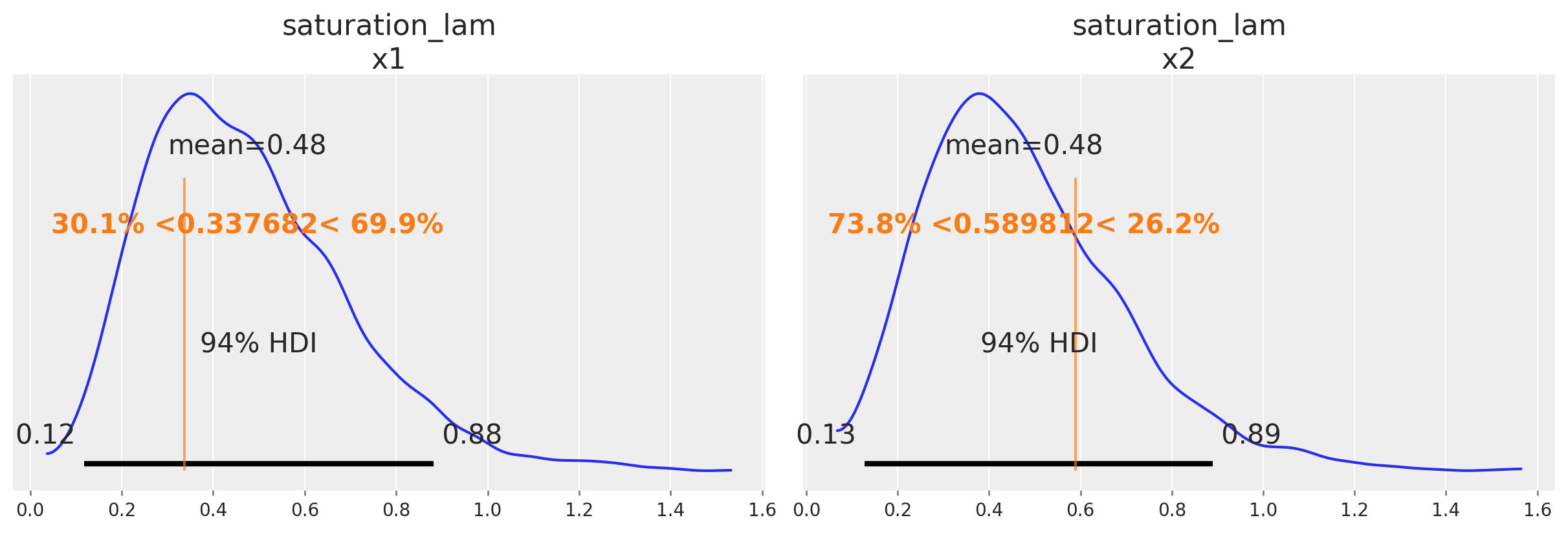Next we look at lambda, which represents the efficiency of a channel. The higher the lambda, the faster sales respond to spending on that channel. We’ll have the lambda parameter be fully pooled across all geographies. We are assuming that channel 1 has the same efficiency in both geographical markets, so we do not specify “geo” dims.