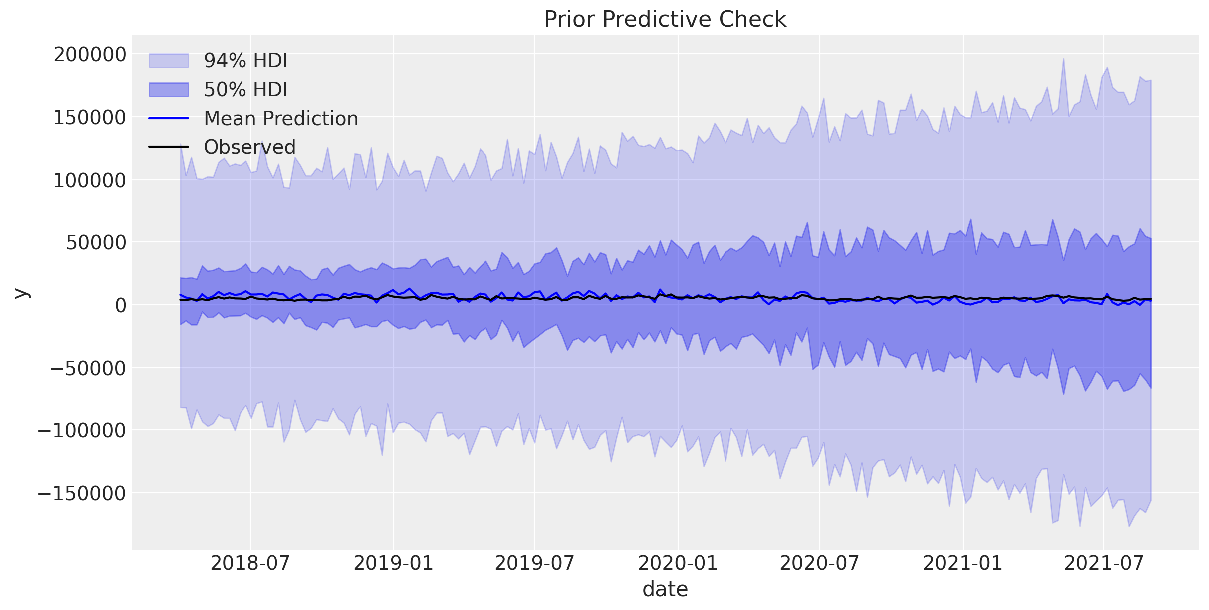 We see that we have captured the linear trend, events contributions and the seasonalities in the data. The remaining variation is due to the media channels, which is exactly what we want to understand.