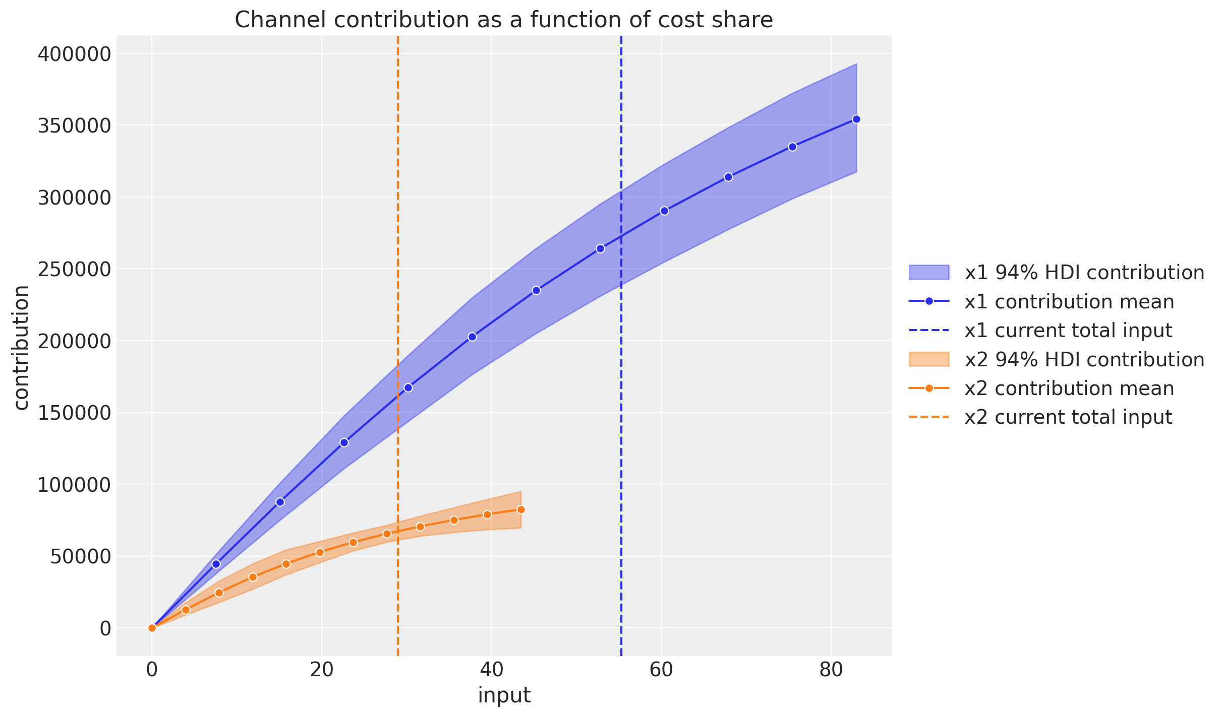 Here we can also see the saturation effect and the relative contribution of each channel as a function of the share spend level on the aggregate time period.