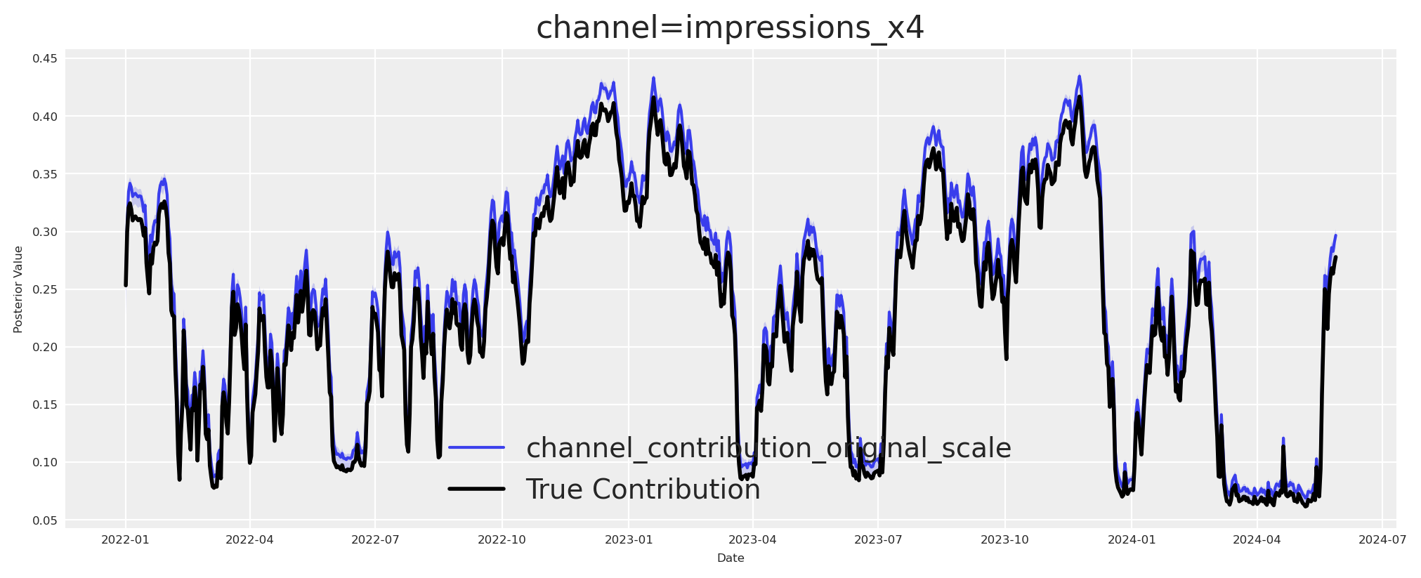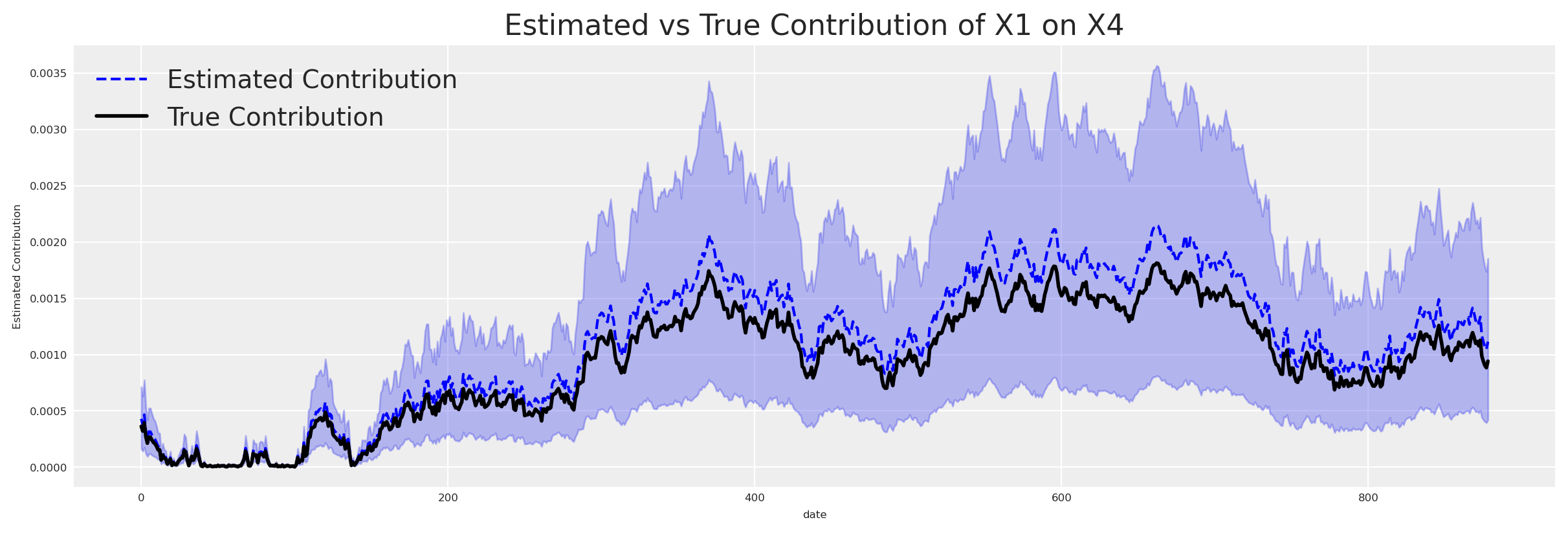 Great, we can see that the estimated contribution is very close to the true contribution in the in-sample period. We can do the same for the out-of-sample period, and using the out of sample period, we can check if we recovered the causal effect of \(X1\) on \(Y\).
